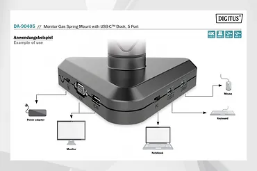 Uchwyt na monitor ze zintegrowaną stacją dokującą łączy w sobie ergonomię i komfort w niespotykany dotąd sposób. Zintegrowana sprężyna gazowa i funkcja Quick-Release ułatwiają ustawienie odpowiedniej pozycji i mocowanie monitora. Gniazda stacji dokującej są dostępne w środkowej części na mocowaniu zaciskowym. Można skorzystać ze złącz HDMI, VGA i USB, aby podłączyć telefon komórkowy, a dzięki obsłudze technologii Power Delivery możliwe jest ładowanie przez USB-C.