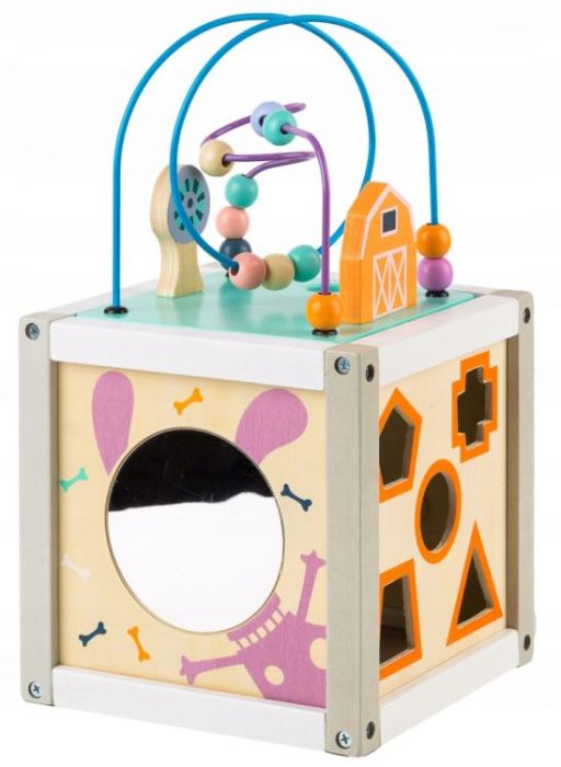 Każda ze ścian posiada inną funkcjonalność, w kostce znajdują się liczne ruchome elementy i pokrętła rozwijające zdolności manualne dziecka. Całość wykonana z drewna, zdejmowana górna pokrywa posiada metalowe pręciki, po których można przesuwać kolorowe koraliki.
