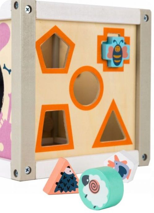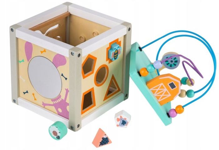 Sorter wraz z klockami pozwala poznawać kształty, oraz rozwija manualne umiejętności naszego szkraba. W komplecie 5 kolorowych klocków o różnych kształtach, a bezpieczne lustereczko pozwoli maluchowi przejżeć się. Przeplatankę można odłączyć od kostki, nałożyć ją na górę kostki lub po skończonej zabawie schować ją w środku kostki. W labiryncie ciekawy kształt elementów pozwala się z łatwością obracać i przesuwać po wyciętych w drewnie torach. Poprawia koordynację wzrokowo - ruchową.