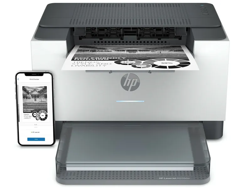 Zapewnij sobie wygodę drukowania w domu i miejscu pracy dzięki drukarce laserowej HP LaserJet M209dw. Ta kompaktowa drukarka umożliwia niedrogi wydruk wysokiej jakości dokumentów i grafik. Jest także łatwa w użytkowaniu. Bezprzewodowe połączenie umożliwia wygodne drukowanie bezpośrednio z urządzeń mobilnych, takich jak smartfony i tablety. HP LaserJet M209dw zmieści się praktycznie w każdym zakątku Twojego domowego biura, co pozwoli Ci utrzymać porządek i harmonię.