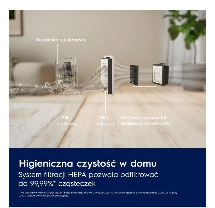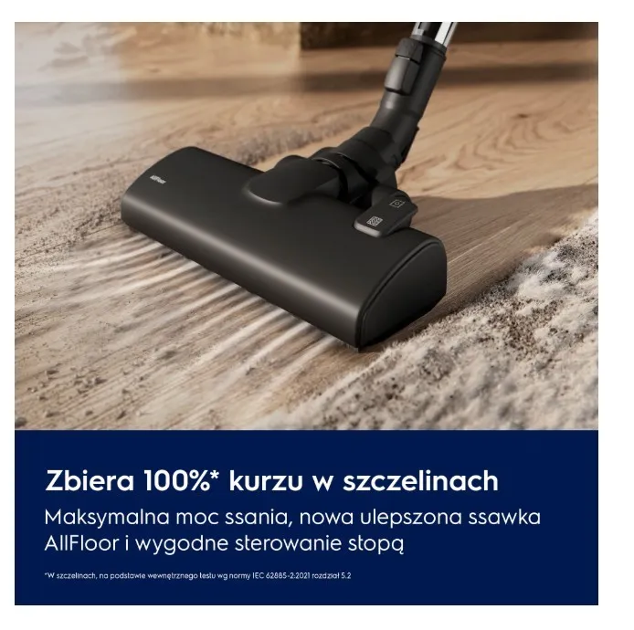 Za sprawą 100-procentowej* skuteczności zbierania kurzu w szczelinach, dużej siły ssania i nowej ssawki AllFloor możesz skutecznie usuwać kurz i brud z twardych powierzchni i dywanów. Ponadto tryb szczotki przełączysz za pomocą stopy.
