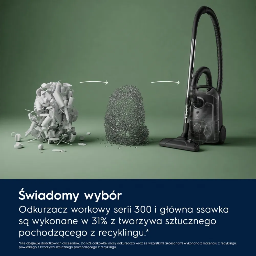 Odkurzacz workowy serii 300 i główna szczotka tego produktu są wykonane w 31% z tworzywa sztucznego pochodzącego z recyklingu*.