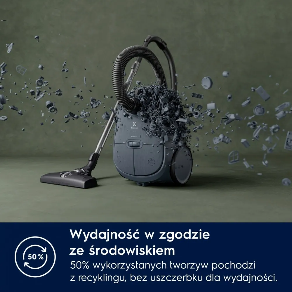 Aż 50% plastiku wykorzystanego do produkcji odkurzacza pochodzi z recyklingu, a dołączona instrukcja, drukowana jest na papierze z makulatury. Odkurzacz jest przyjazny środowisku bez straty wydajności.