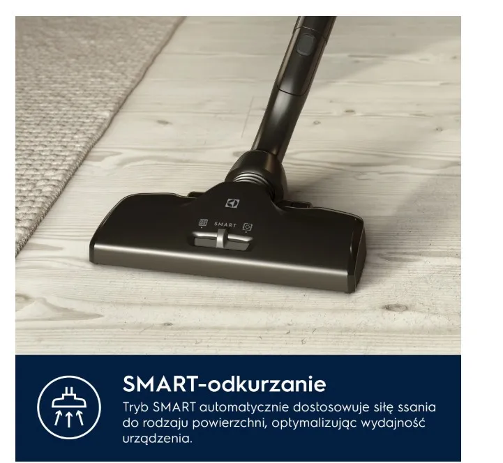 Technologia SmartMode automatycznie wykrywa rodzaj podłogi i dostosowuje do niej moc odkurzacza. Dzięki temu swobodnie i dokładnie odkurzysz dywany oraz podłogi twarde bez konieczności zmiany ustawień.
