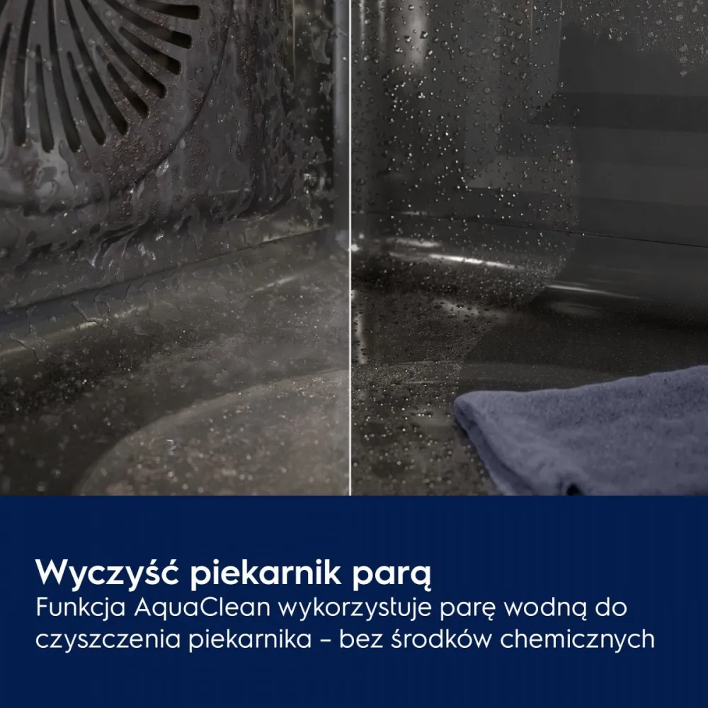 Piekarnik wykorzystuje parę wodną, aby ułatwić czyszczenie bez użycia silnych chemikaliów. W trybie AquaClean urządzenie odparowuje wodę z komory piekarnika. Para następnie rozpuszcza zabrudzenia, umożliwiając naturalne czyszczenie za pomocą wilgotnej szmatki.