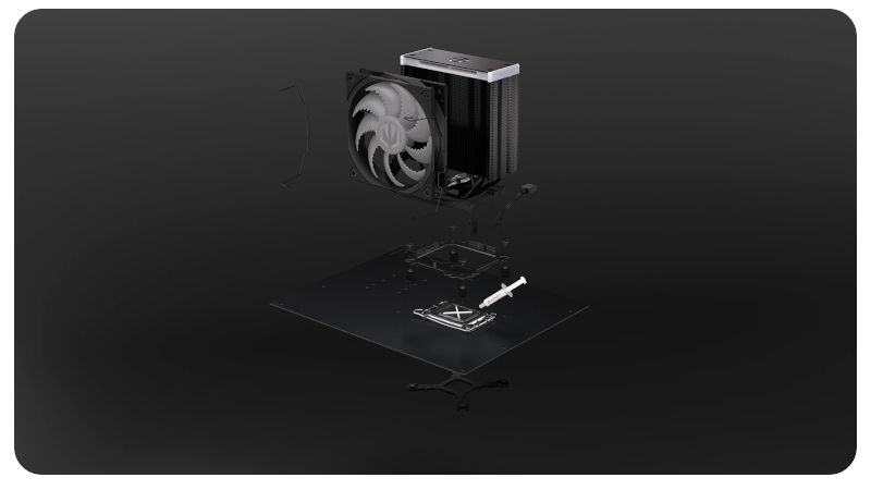 Fera 5 Black ARGB to połączenie wydajności, stylu i wygody. Jej komponenty utrzymane w głębokiej czerni doskonale prezentują się w każdej konfiguracji – zarówno w klasycznych zestawach, jak i w towarzystwie podświetlanych podzespołów. Dzięki specjalnej ramce montażowej instalacja coolera jest szybka i intuicyjna – nawet dla osób, które po raz pierwszy składają komputer. Co więcej, szeroka kompatybilność z podstawkami AMD i Intel sprawia, że Fera 5 Black ARGB będzie pasować do większości popularnych platform.
