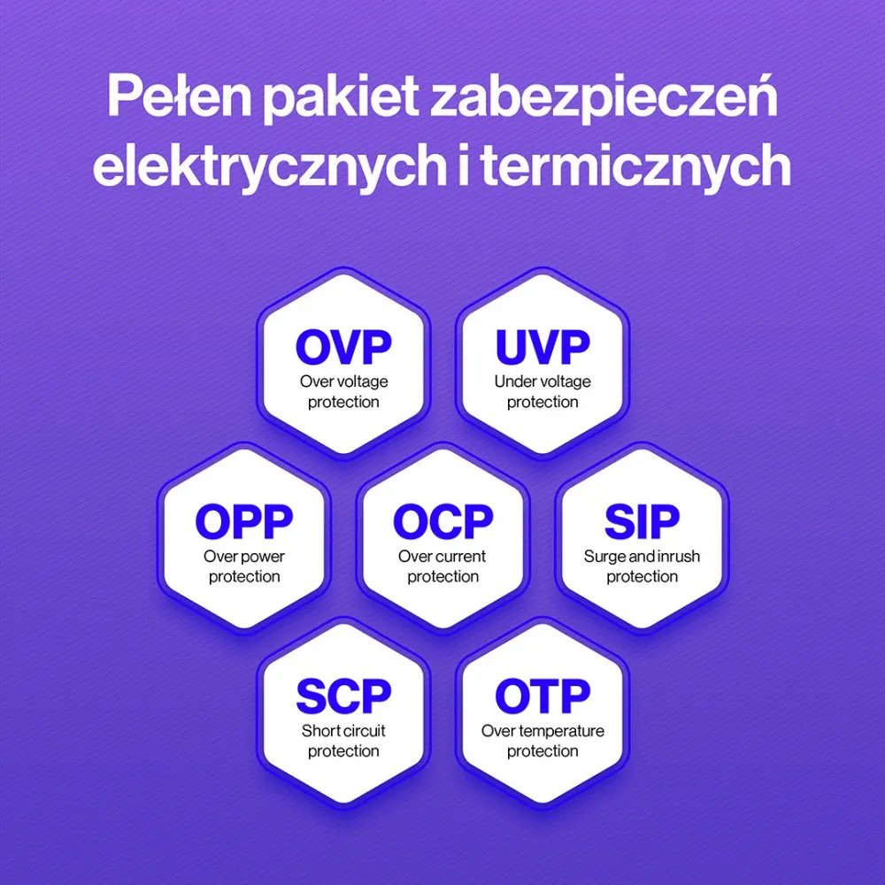 Jednostka posiada pełny pakiet zabezpieczeń elektrycznych i termicznych. Oznacza to, że Twój komputer jest chroniony przed przeciążeniami, skokami napięcia, zwarciami i przegrzaniem zasilacza, co zapewnia stabilność i bezpieczeństwo nawet w najbardziej niespodziewanych przypadkach.