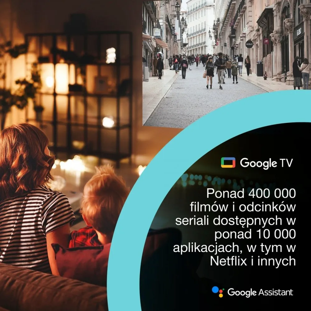 - Google TV i Asystent Google: łatwy dostęp do ponad 400 000 filmów i programów z ulubionych aplikacji i telewizji abonamentowych, takich jak Netflix i nie tylko - wszystko w jednym miejscu.
