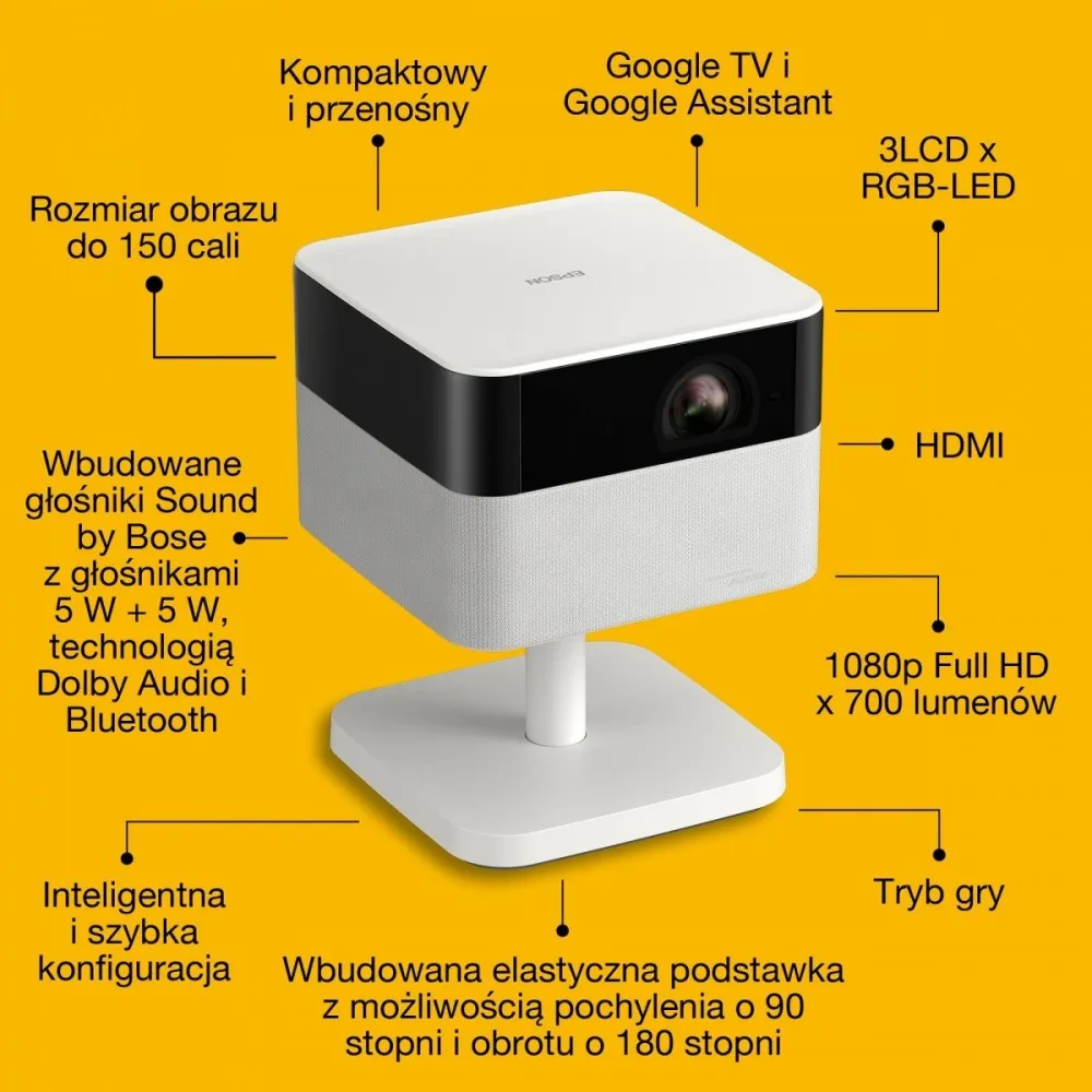 - Elastyczna projekcja dzięki inteligentnej, natychmiastowej konfiguracji: płynne działanie w pomieszczeniach i na zewnątrz oraz automatyczna konfiguracja ułatwiająca przenoszenie. Regulowana podstawa o obrocie 180° i nachyleniu 90° umożliwia projekcję na dowolnej powierzchni - w domu lub w podróży.