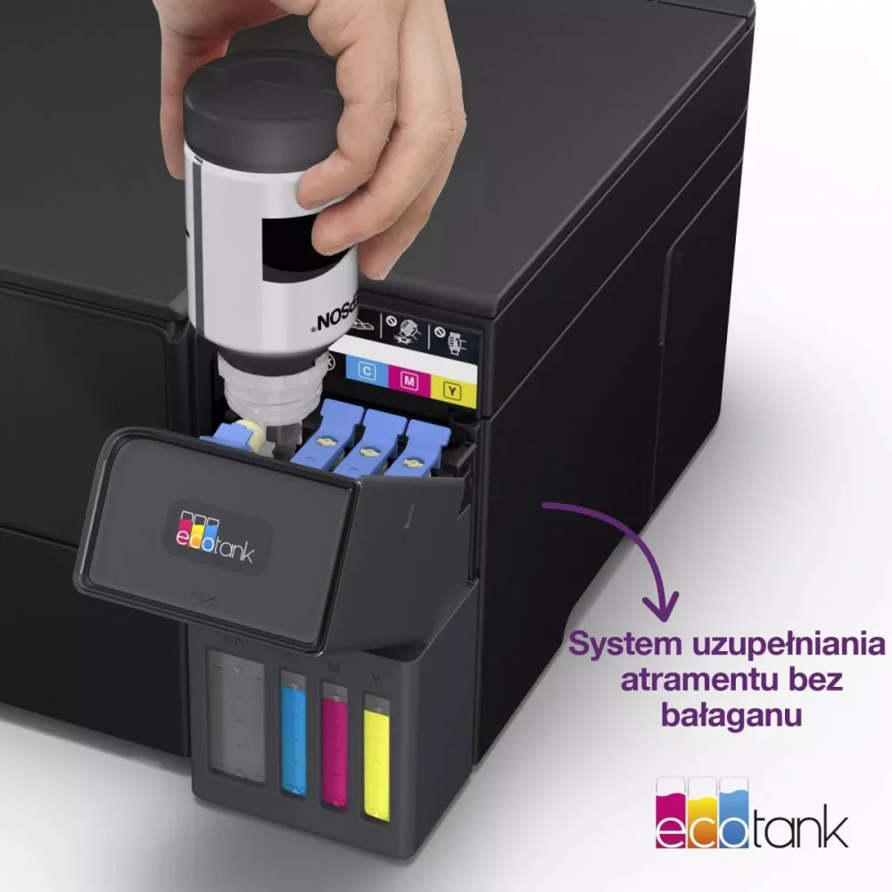 - Prosty, bezproblemowy system stałego zasilania w atrament pozwala na uzupełnianie zbiorników z butelek System butelek z blokadą EcoTank zapewnia czystość