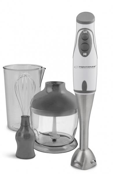 Urządzenie zostało wyposażone we wszystkie potrzebne akcesoria: pojemnik do mieszania - 500 ml, pojemnik do siekania - 750 ml (z ostrzem ze stali nierdzewnej i pokrywką), a także nasadka do ubijania ze stali nierdzewnej.