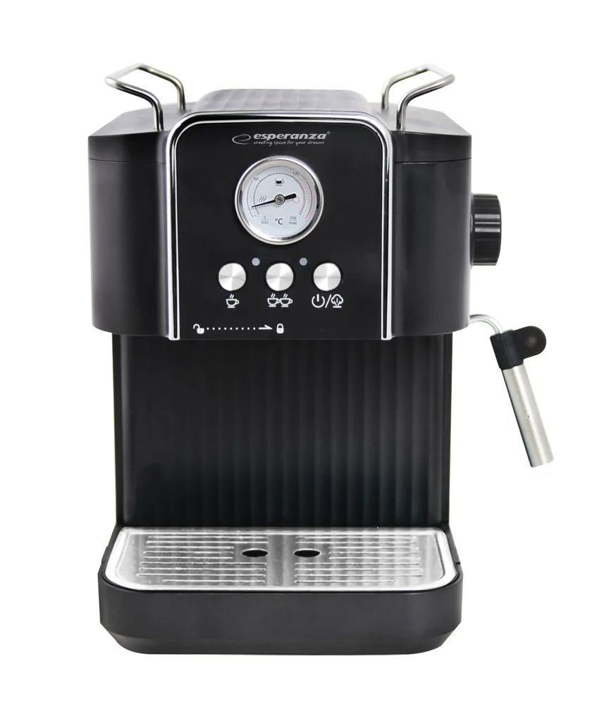 Esperanza EXCELSA to nowoczesny i wydajny ekspres ciśnieniowy, który pozwala cieszyć się doskonałą, świeżo parzoną kawą każdego dnia. Dzięki zbiornikowi na wodę o pojemności 1.8 litra można przygotować jednorazowo do 10 filiżanek napoju, co sprawia, że urządzenie idealnie sprawdzi się zarówno w domu, jak i w biurze. Moc 850 W oraz ciśnienie 20 barów zapewniają szybkie parzenie kawy o pełnym, intensywnym smaku i bogatym aromacie. Ekspres został wyposażony w praktyczny spieniacz do mleka, który umożliwia przygotowanie napojów mlecznych takich jak cappuccino czy caff latte. Wbudowany wskaźnik temperatury pozwala kontrolować proces parzenia, a podgrzewana płyta na filiżanki utrzymuje odpowiednią temperaturę naczyń, by kawa na dłużej zachowała idealny smak. Płynna regulacja emisji pary umożliwia dostosowanie pracy urządzenia do indywidualnych preferencji, a elegancki design sprawia, że ekspres Esperanza EXCELSA doskonale wkomponuje się w każdą nowoczesną kuchnię.