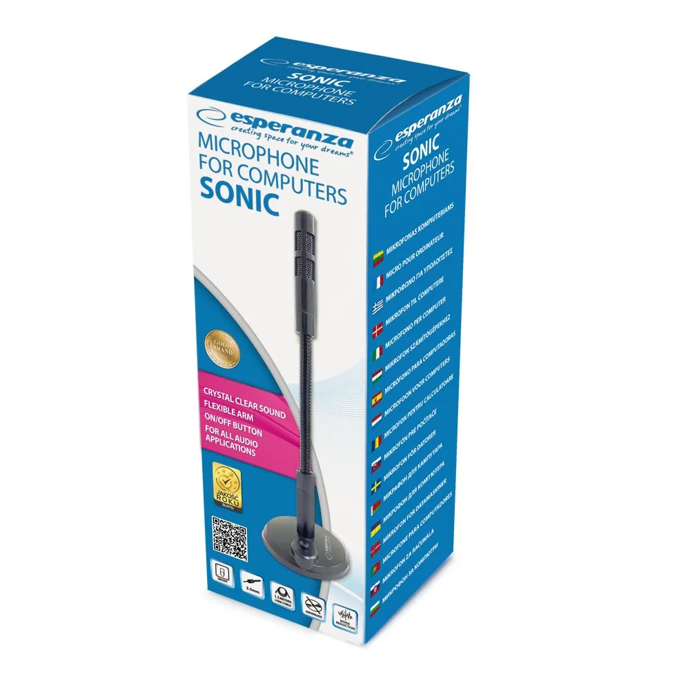 Mikrofon Esperanza SONIC jest urządzeniem dedykowanym do komputerów stacjonarnych i przenośnych. Posiada uniwersalne złącze mini jack, dzięki czemu może zostać podłączony do rozmaitych urządzeń posiadających slot zewnętrzny 3,5 mm oraz przycisk ON/OFF, pozwalający na włączenie lub wyłączenie modelu w dowolnym momencie. Urządzenie posiada także elastyczne, regulowane ramię umieszczone na stabilnej podstawce.