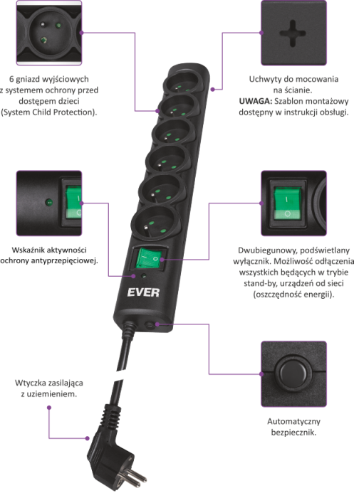 Nowa listwa Ever posiada sześć uziemionych gniazd sieciowych wyposażonych dodatkowo w ochronę Child protection. Uniemożliwia ona dostęp dzieciom do elementów niebezpiecznych, zapobiega włożeniu palca lub różnych przedmiotów do gniazdka i bezpośrednio chroni najmłodszych przed porażeniem. Podświetlany wyłącznik, umieszczony na czarnej obudowie, w jasny sposób sygnalizuje zasilanie sieciowe. Umożliwia proste odłączenie nieużywanych odbiorników bez wyciągania wtyczki z gniazda sieciowego. Dzięki temu można minimalizować zużycie energii elektrycznej oraz generować realne oszczędności. Szacunkowo koszt zakupu listwy może zwrócić się już po 6 miesiącach odpowiedniego użytkowania.