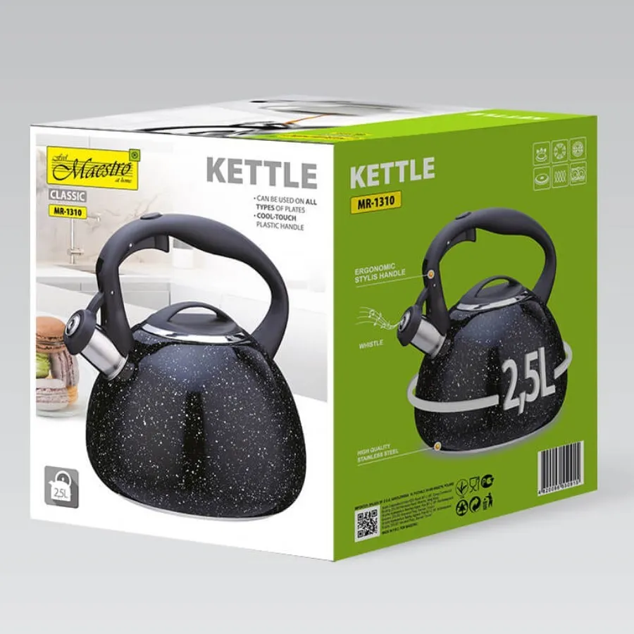 Czajnik nieelektryczny Maestro MR-1310 to funkcjonalne urządzenie z gwizdkiem, które sprawdzi się w każdej kuchni. Wykonany z wysokiej jakości stali nierdzewnej, cechuje się solidnością oraz eleganckim wyglądem. Pojemność czajnika wynosi 2,5 litra, co umożliwia jednorazowe zagotowanie ilości wody, idealnej na herbatę lub kawę dla całej rodziny.
