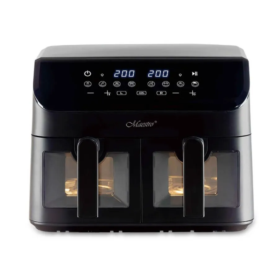 Podwójna frytownica beztłuszczowa Air Fryer Maestro MR-758 o mocy max. 2000W to idealne rozwiązanie dla każdego, kto pragnie cieszyć się smakiem ulubionych potraw bez dodatku tłuszczu. Dzięki dwum pojemnym koszom o wielkości 4,5l, można przygotować zdrowe posiłki dla całej rodziny w jednym czasie.
