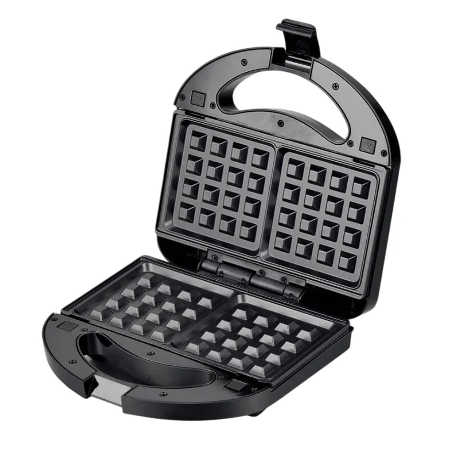 - W zestawie znajdują się 3 wymienne płytki: grillowa, do gofrów oraz do ciasteczek orzeszków, co czyni go bardzo funkcjonalnym.