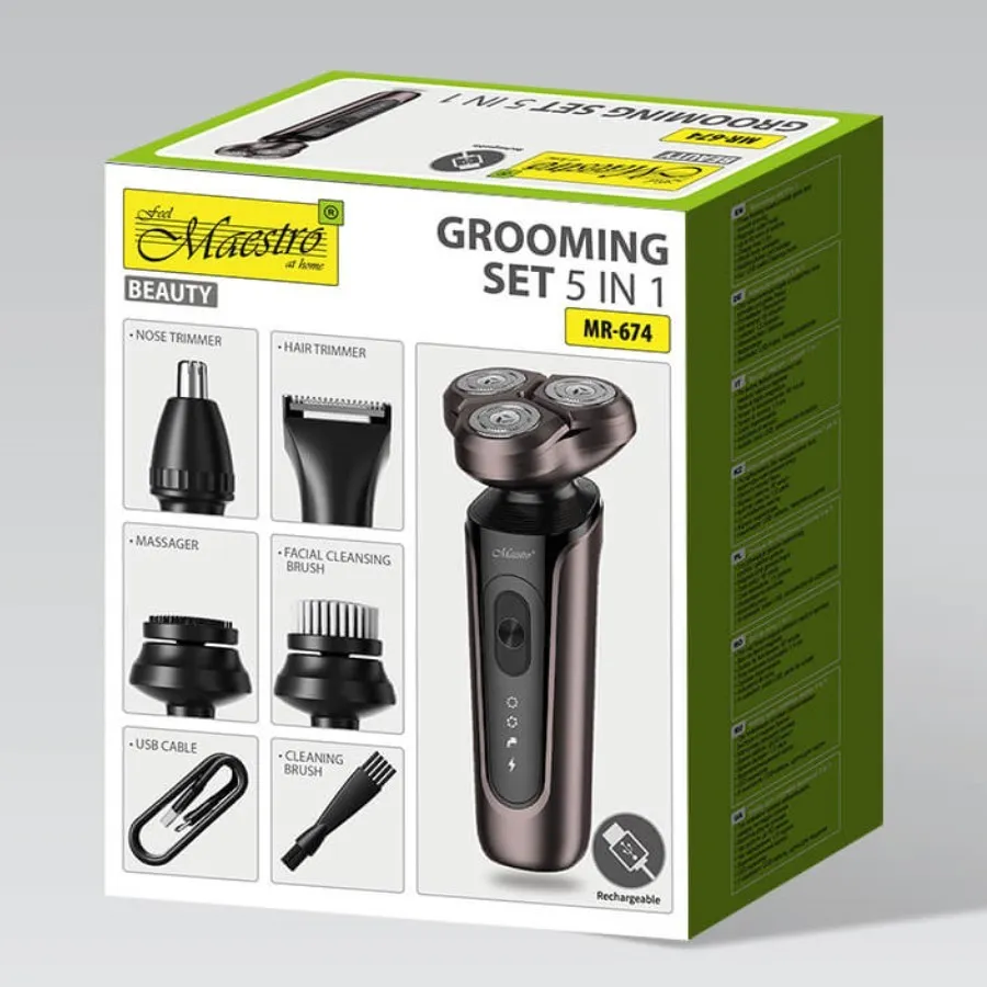 Zestaw do golenia 5w1 USB-C Maestro MR-674 to kompleksowe rozwiązanie dla mężczyzn, które łączy w sobie nowoczesną technologię i funkcjonalność.