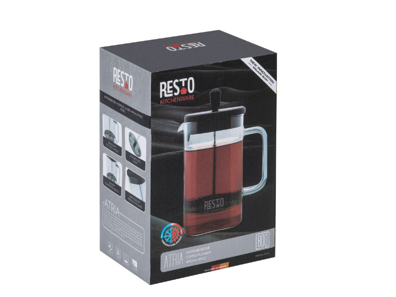 Nowoczesna i praktyczna francuska prasa umożliwi ci przygotowanie kawy lub herbaty według twoich preferencji. Prostota obsługi oraz klasyczny design gwarantują bezstresowe przygotowanie oraz idealne dopasowanie do wnętrza. Idealny smak kawy lub herbaty wymaga czystego wnętrza prasy, które bez problemu wyczyścisz. Głównym zamysłem produktu był uniwersalny design i dopasowanie prasy do każdego wnętrza w jakim się znajdzie. Prostota oraz łatwa obsługa to właśnie to czym wyróżnia się sprzęt od Resto.