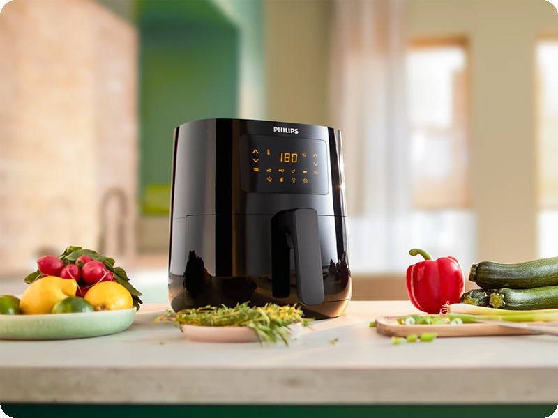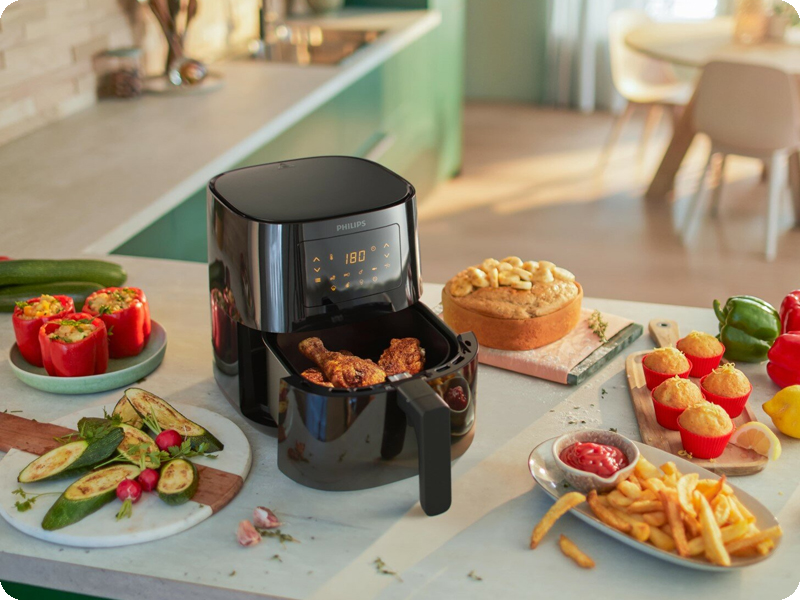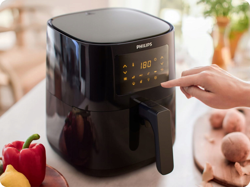 Frytkownica marki Philips oferuje szeroki wachlarz możliwości: smażenie, pieczenie, grillowanie, prażenie, suszenie, podpiekanie, rozmrażanie, odgrzewanie i nie tylko. Ekran dotykowy z 7 ustawieniami pozwoli Ci na szybkie i wygodne przygotowywanie posiłków. Dotknij przycisku i rozpocznij pieczenie. Zaprogramowane ustawienia obejmują mrożone przekąski, świeże frytki, mięso, ryby, podudzia z kurczaka, ciasto, a nawet grillowane warzywa.