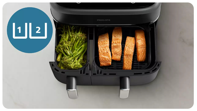 2 szuflady frytownicy: duża szuflada jest idealna do dań głównych, frytek i innych ulubionych dań. W mniejszej szufladzie możesz przyrządzić przystawki, warzywa i przekąski. Co więcej możesz automatycznie zsynchronizować czas gotowania w 2 szufladach, aby podać wszystkie potrawy jako jeden świeży i gorący posiłek.