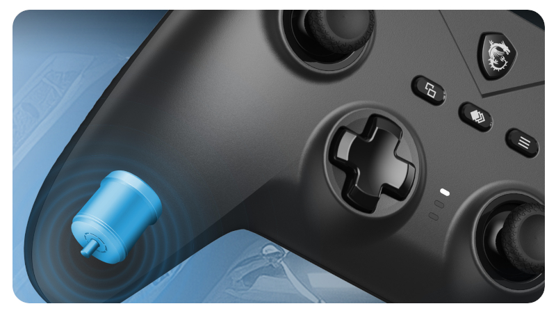 Kontroler zaprojektowano z myślą o graczach, którzy wymagają zarówno wysokiej precyzji, jak i ergonomii. MSI FORCE GC200 zapewni Ci wyjątkową przewagę w grach za sprawą spustów wykorzystujących efekt Halla, gwarantującym wyrazistą, responsywną reakcję, a także dzięki zaawansowanym, analogowym drążkom, które oferują wyjątkowo płynną i dokładną kontrolę nad przebiegiem gry. Immersyjne, haptyczne sprzężenie zwrotne wyzwalane przez dwa silniki wibracyjne pogłębia wszystkie sensoryczne doznania, a antypoślizgowy grip z wyraźną teksturą powierzchni zapewnia wysoki komfort gry oraz pewność chwytu podczas każdej, nawet najbardziej intensywnej rozgrywki.