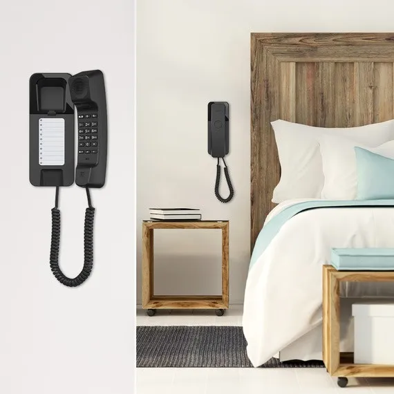 ZajmujÄcy niewiele miejsca, przewodowy telefon biurkowy i Ĺcienny