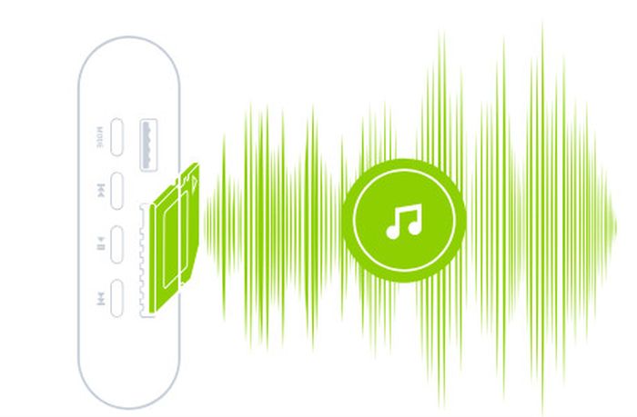 Rozładował się smartfon? Spokojnie - możesz odtwarzać muzykę bezpośrednio z kardy pamięci, wykorzystując wbudowany slot na takowe karty. Urządzenie odczyta i odtworzy z niego muzykę automatycznie.