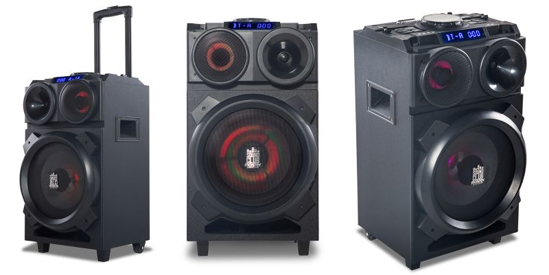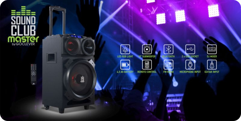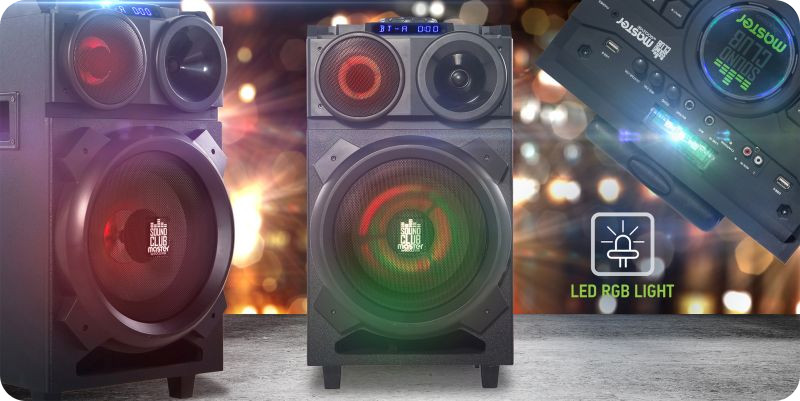SOUND CLUB MASTER jest idealny jeżeli planujesz imprezę nie tylko w domu ale również w plenerze dzięki konstrukcji zaprojektowanej do łatwego przenoszenia: wytrzymałe kółka i wysuwany uchwyt transportowy. Zestaw ten nie ogranicza cię tylko do odsłuchiwania ulubionych utworów ale także posiada funkcję karaoke, dzięki której rozkręcisz każdą imprezę. Kolejną funkcją gwarantującą doskonałą zabawę są efekty świetlne LED RGB LIGTH – czyli światło wydobywające się z membrany głośnika w rytm muzyki – to z pewnością pomoże zamienić każde pomieszczenie w salę dyskotekową gwarantując niesamowite wrażenia.