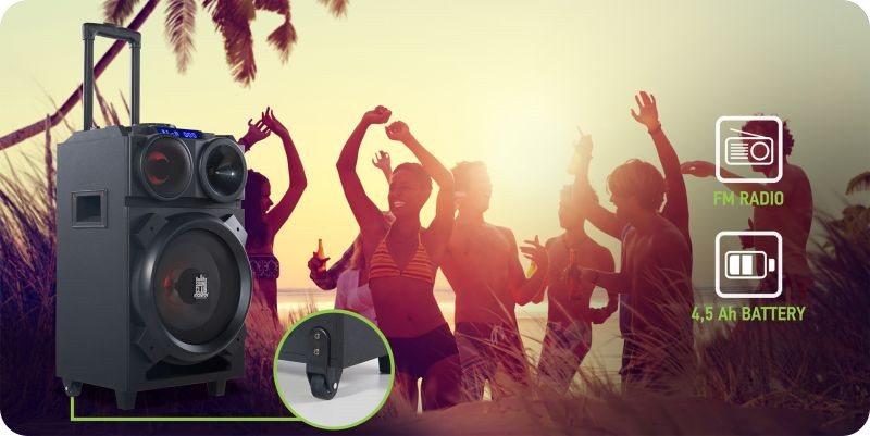 Hi-Fi Class Bluetooth zapewni wysokiej jakości bezprzewodowe połączenie z twoim smartfonem, tabletem lub komputerem na odległość 10 metrów. Głośnik wyposażony jest w aż 2 porty USB, które pozwalają na odtwarzanie muzyki z dowolnych pamięci przenośnych. Dzięki zawartemu w zestawie pilotowi, można zdalnie sterować całym zestawem podczas imprezy zarówno w domu jak i w sali klubowej. Głośnik odtwarza pliki MP3, posiada również radio FM. Warto też wspomnieć o wyjątkowym designie tego głośnika, którego wyróżnikiem jest zwarta i jednorodna konstrukcja. Mobilność urządzenia zapewni wydajna bateria o pojemności 4500 mAh dzięki, której imprezę rozkręcisz w najdalszym zakątku ogrodu a nawet na plaży ciesząc się 6 godzinnym ciągłym odtwarzaniem ulubionej playlisty. Urządzenie jest wyposażone w następujące złącza: 2 x jack 6,3 mm (2 mikrofony lub mikrofon i gitara), wejście liniowe LINE-IN (mini jack), wejście kanałowe RCA (2 x cinch), wyjście słuchawkowe (mini jack) oraz specjalne złącza zasilania 12V pozwalające na zasilenie głośnika z dowolnego akumulatora (np. samochodowego).