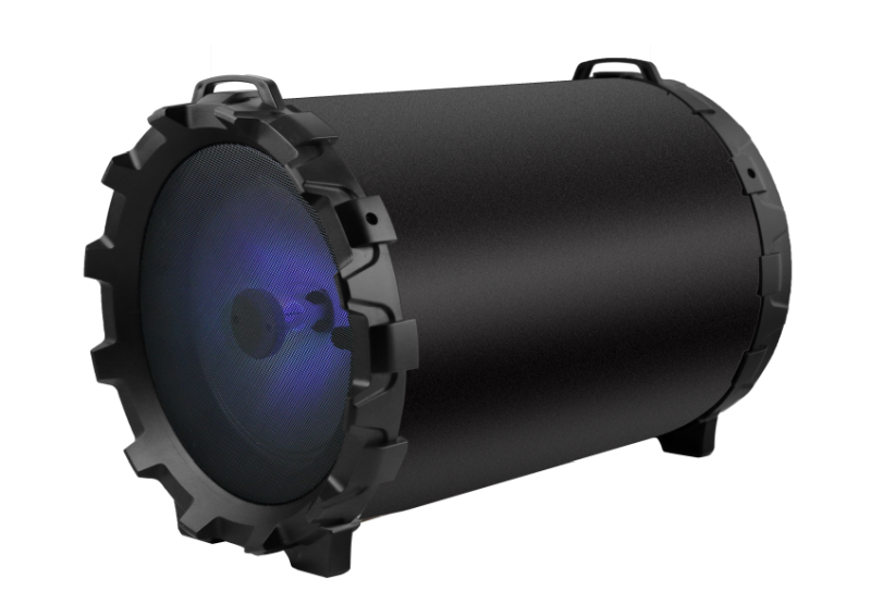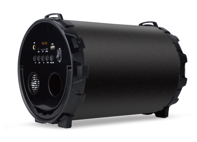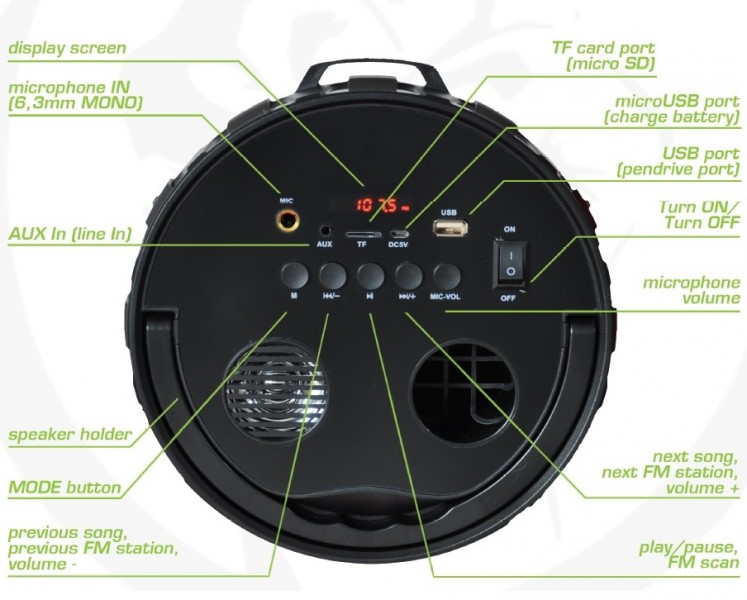 Ważną cechą zestawu jest obudowa, która bez wątpienia wpływa na jakość brzmienia. Wydobywający się dźwięk z głośnika jest niezwykle czysty. Na panelu przednim znajduje się wyświetlacz informacyjny LED, włacznik, port USB, wejście AUX, wejście MONO i slot na karty pamięci microSD oraz gniazdo microUSB służące do ładowania.