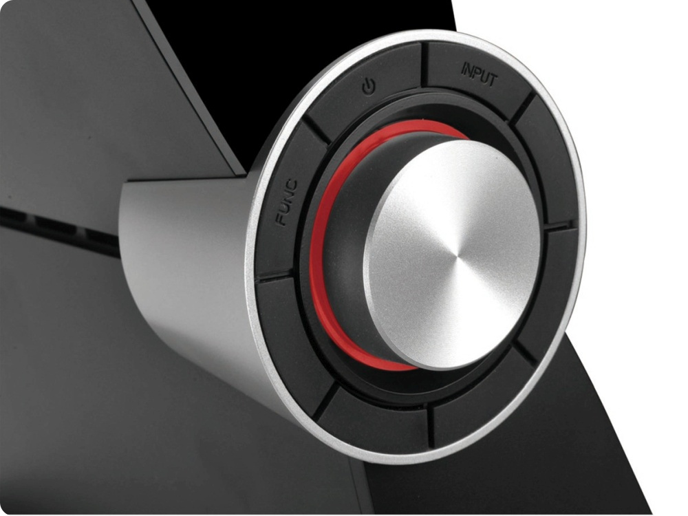 - Bezprzewodowy pilot zdalnego sterowania umożliwiający kontrolę głośności, basów i tonów wysokich oraz wybór wejścia, wyciszenie i przejście w stan czuwania