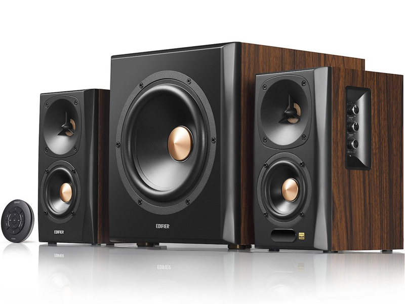 Głośniki Edifier 2.1 S360DB nadadzą się idealnie do słuchania muzyki zarówno w domu, jak i w pracy. Mimo że są niewielkie, to drewniana obudowa MDF kryje w sobie pokłady niespożytej mocy, natomiast bezprzewodowy subwoofer znacznie zwiększa możliwości ustawienia głośników. Ponadto sprzęt jest wyposażony w złącza stereo RCA, koncentryczne i optyczne, oraz Bluetooth.