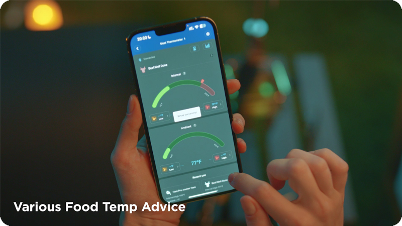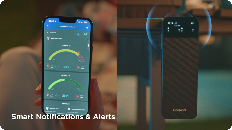 Dzięki aplikacji Govee Home, możesz monitorować temperaturę mięsa bez wychodzenia z kuchni. Aplikacja umożliwia ustawienie alarmu, który powiadomi Cię o osiągnięciu zadanej temperatury. Bluetooth i Wi-Fi zapewniają szybkie połączenie, co pozwala na wygodne kontrolowanie procesu gotowania z dowolnego miejsca.