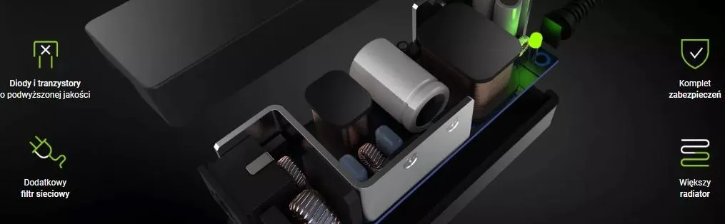 Przemyślana konstrukcja i wysoka jakość komponentów wpływają na podwyższoną trwałość ładowarki. Dodatkowy filtr sieciowy filtruje napięcie już na wejściu zasilacza, a większy radiator efektywniej odprowadza ciepło dzięki czemu ładowarka nie nagrzewa się. Wszystko to sprawia, że zasilacz jest zdumiewająco wytrzymały i może pracować bezawaryjnie latami.