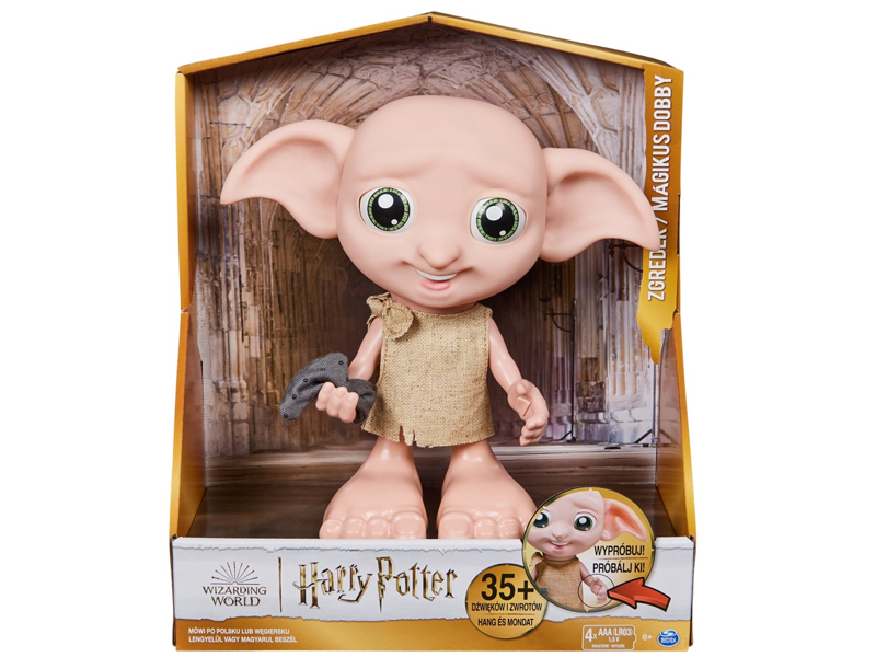 Zgredek to czarująca interaktywna zabawka, dzięki której młode czarownice i młodzi czarodzieje mogą ponownie przeżyć magię Harry’ego Pottera. Ukochany skrzat domowy ma miękkie silikonowe uszy, duże zielone oczy i sympatyczną buzię. Chwyć Zgredka za dłoń, by figurka ożyła! Magiczny skrzat reaguje na dotyk uroczymi powiedzonkami oraz ruchami uszu, głowy i rąk, a także mruganiem. Aby uzyskać więcej czarodziejskich reakcji, podaruj Zgredkowi skarpetę! Umieść dołączoną skarpetkę w jego dłoni i sprawdź, co powie. Dzięki filmowemu wyglądowi i oryginalnym detalom Zgredek zainspiruje dziecięcą wyobraźnię, zachęcając do snucia magicznych opowieści. Czekają was wspaniałe, interaktywne przygody.