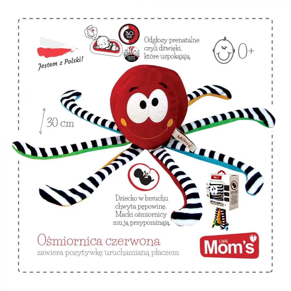 Mięciutka, materiałowa i kontrastowa ośmiornica z dźwiękami prenatalnymi od Mom's care została stworzona z myślą o najmłodszych. Przytulanka kontrastowa emituje dźwięki prenatalne, które maluch słyszał będąc jeszcze w Twoim brzuchu. Bicie serca mamy, szum wód płodowych wpływają na niemowlaka uspokajająco i relaksująco. Dzięki dźwiękom prenatalnym niemowlę lepiej się rozwija, jest spokojniejsze oraz łatwiej i szybciej zasypia. Dziecko będąc w brzuchu, chwyta pępowinę. Macki ośmiornicy mają mu ją przypominać. Kiedy potrzesz ośmiornicę o swoją skórę i położysz ją obok swojego maleństwa wzbudzisz w nim poczucie bezpieczeństwa i komfortu, które towarzyszyły mu przez ostatnie 9 miesięcy.