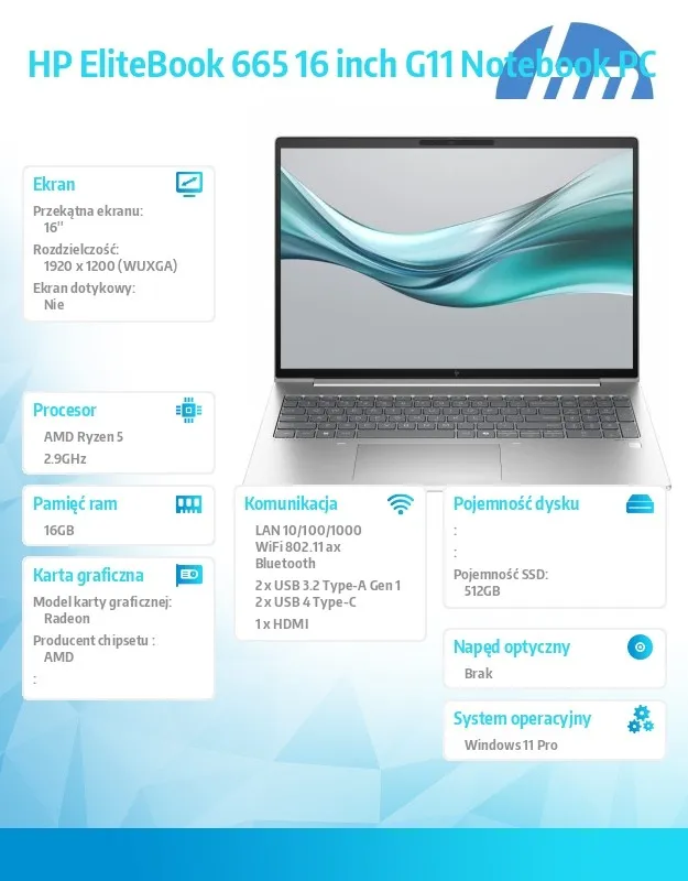 Spełnij zróżnicowane wymagania swoich pracowników, dzięki szerokiej gamie konfigurowalnych funkcji zabezpieczonego i łatwego w zarządzaniu komputera HP EliteBook 665. Zaprojektowany z ekranem o proporcjach 16:10, który eliminuje potrzebę przewijania, oraz procesorem AMD Ryzen serii 7000, który można łatwo dopasować do istniejących środowisk IT.