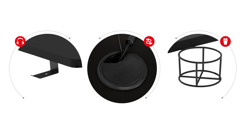 Wygodny, podręczny uchwyt na słuchawki. Podczas gdy nie używasz słuchawek, te wiszą bezpiecznie, nie zajmując przestrzeni na biurku. Biurko Huzaro Hero 8.5 posiada dwa wloty na organizację przewodów. Wloty zamontowano po dwóch stronach biurka, dzięki czemu niezależnie od instalacji, Twoje stanowisko gamingowe zawsze będzie uporządkowane. Specjalny, wygodny uchwyt na napoje. Łatwo i bezpiecznie można przechowywać w nim puszki, butelki, czy kubki. To rozwiązanie pozwoli uniknąć zalania sprzętu i poprawia ergonomie stanowiska.