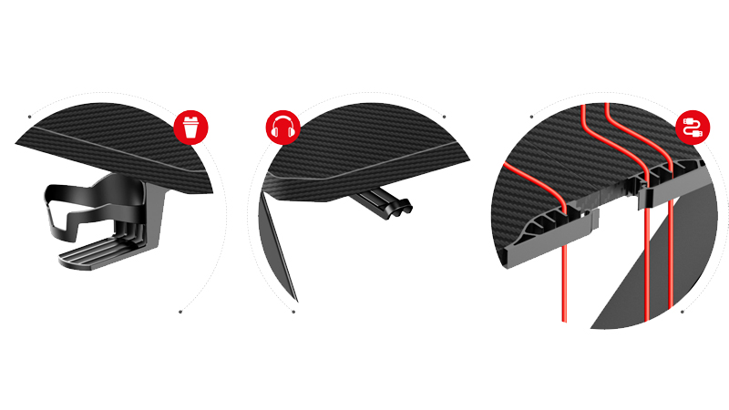 Wygodny, podręczny uchwyt na słuchawki. Podczas, gdy nie używasz słuchawek, te wiszą bezpiecznie, nie zajmując przestrzeni na biurku. Biurko Huzaro Hero 2.8 posiada specjalnie wytłoczony klips na kable z tłu blatu, który umożliwi ich organizację. Twoje stanowisko gamingowe zawsze będzie uporządkowane. Specjalny, wygodny uchwyt na napoje. Łatwo i bezpiecznie można przechowywać w nim puszki, butelki, czy kubki. To rozwiązanie pozwoli uniknąć zalania sprzętu i poprawia ergonomie stanowiska.