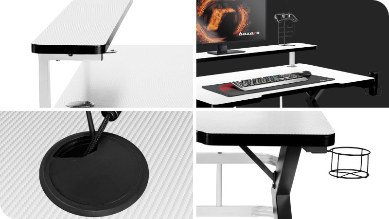 Biurko Huzaro Hero 5.0 posiada dwa wloty na organizację przewodów. Wloty zamontowano po dwóch stronach biurka, dzięki czemu niezależnie od instalacji Twoje stanowisko gamingowe zawsze będzie uporządkowane.