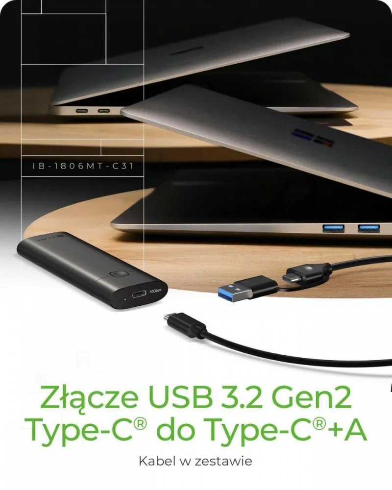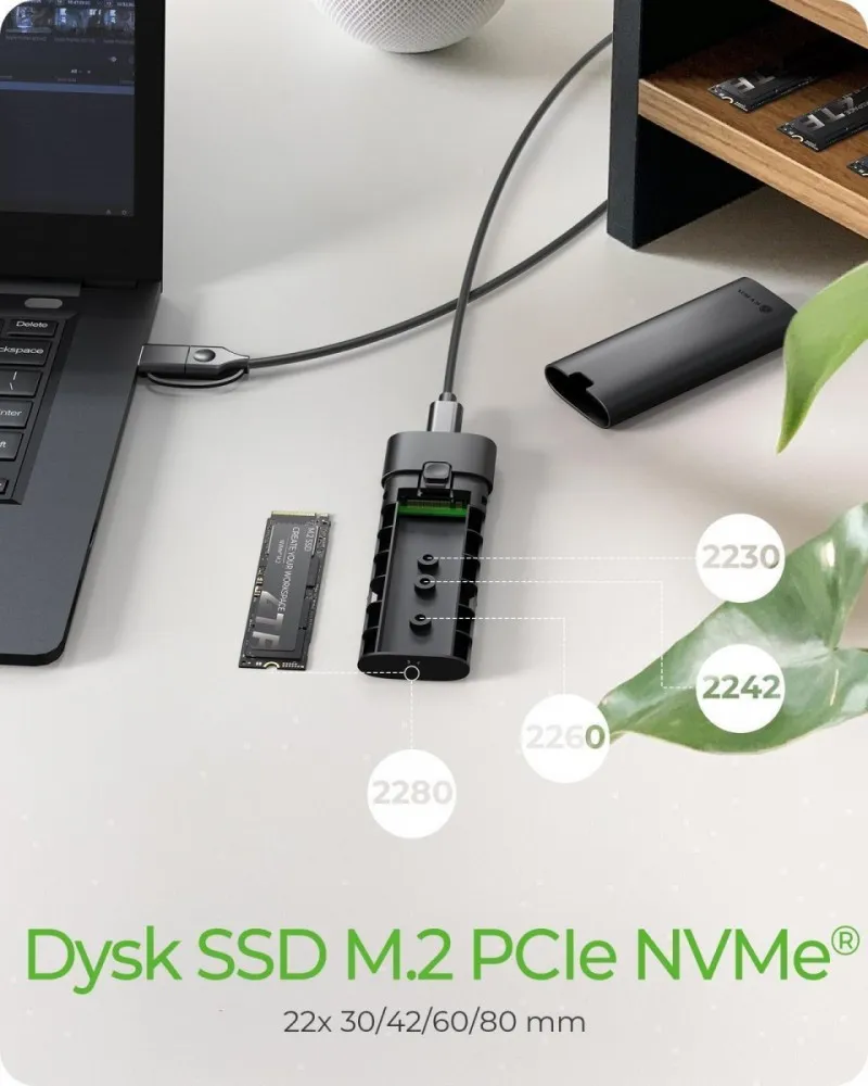 Beznarzędziowa instalacja umożliwia szybkie uruchomienie urządzenia i transfer danych z prędkością do 10 Gb/s. Obudowa została zaprojektowana z myślą o wydajnym zarządzaniu plikami i przetwarzaniu danych. Kompatybilna z dyskami SSD o rozmiarach 22 × 30 / 42 / 60 / 80 mm.