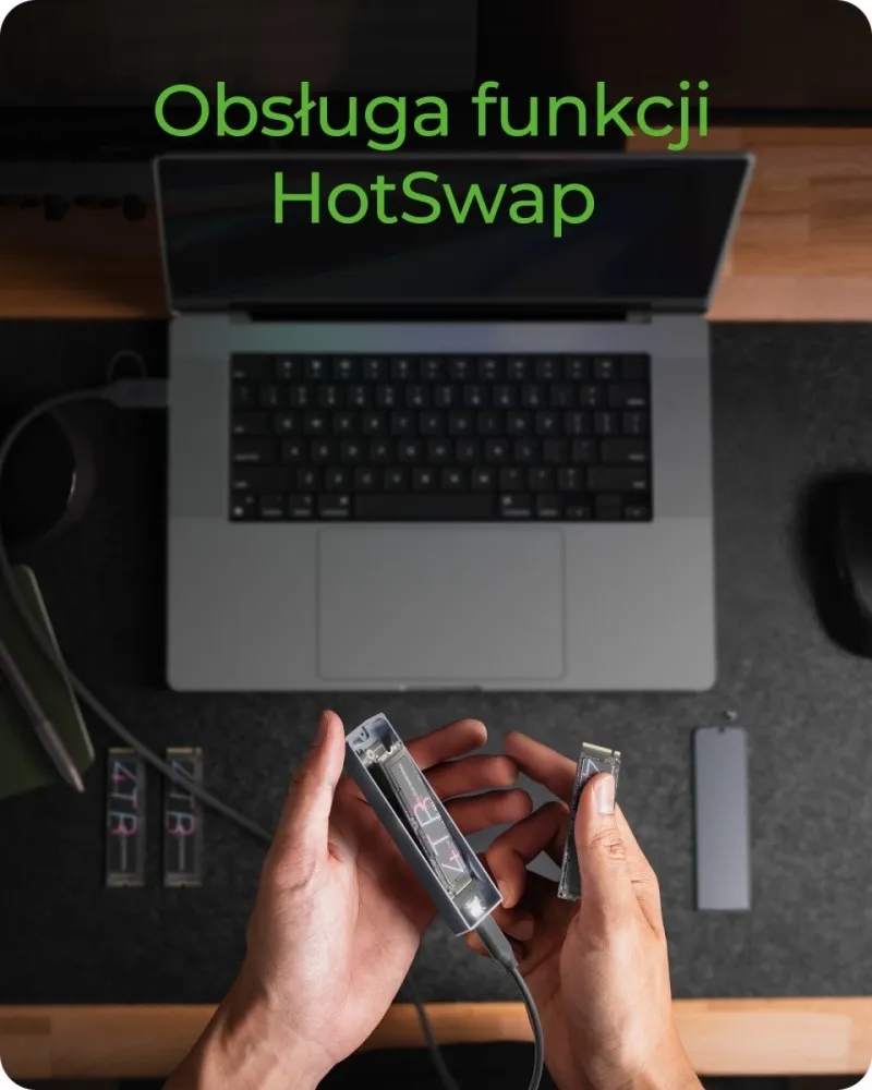 Łatwa wymiana dysków bez konieczności wyłączania systemu. Idealne rozwiązanie do szybkich aktualizacji, tworzenia kopii zapasowych lub uzyskiwania dostępu do wielu dysków SSD bez przestojów.