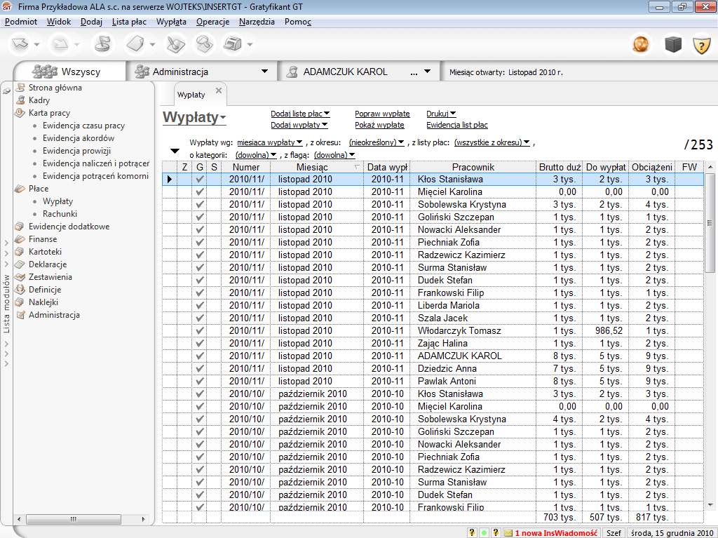 - rozbudowana ewidencja pracowników (badania lekarskie, kursy bhp, nagrody, kary, historia zatrudnienia, podział na grupy, przypisywanie cech, zdjęcia pracownika i wiele innych)