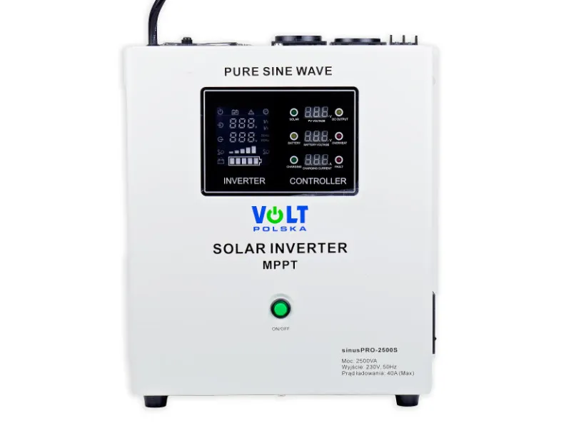 Zasilacz awaryjny SinusPRO 2500 S 24V służy do zasilania urządzeń elektrycznych wymagających napięcia przemiennego 230V z akumulatorów o napięciu stałym 24V. Dodatkowo wbudowany regulator solarny pozwala wykorzystać energię słoneczną (generowaną z podłączonego zestawu paneli fotowoltaicznych) do ładowania akumulatorów i zasilania podłączonego obciążenia. Główne cechy to m.in.: automatyczny stabilizator napięcia sieciowego AVR, wbudowana ładowarka sieciowa do ładowania podłączonego akumulatora, wbudowana przetwornica typu czysty SINUS oparta na transformatorze toroidalnym, wbudowany regulator solarny MPPT.