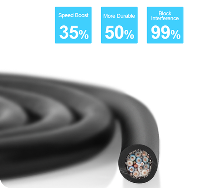 Przewody HDMI Uniteka wykonane są w 100% z miedzi, mają pozłacane końcówki i charakteryzują się najwyższymi parametrami. 19 żyłowy przewód zapewnia szybki i stabilny sygnał bez żadnych zakłóceń. W porównaniu do standardowych przewodów dostępnych na rynku, technologia stosowana przez Uniteka zapewnia do 35% szybszy przesył sygnału.