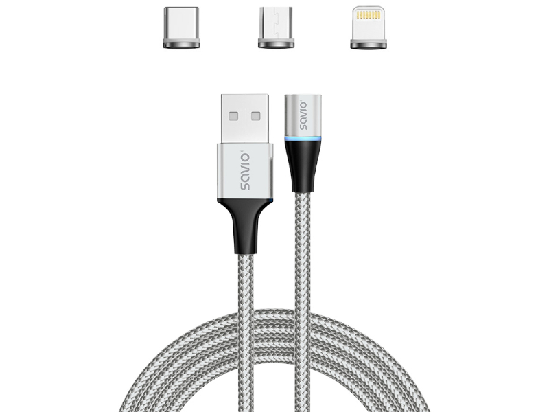 Magnetyczny kabel USB marki SAVIO, to innowacyjne, niezwykle wygodne rozwiązanie dla urządzeń mobilnych. W przeciwieństwie do klasycznego kabla USB posiada trzy odłączane końcówki: USB-C, Micro-USB oraz Lightning. Wymienne końcówki ze złączami poszczególnych typów umożliwiają zarówno ładowanie, jak i przesyłanie danych do urządzeń z różnymi wejściami zasilającymi.