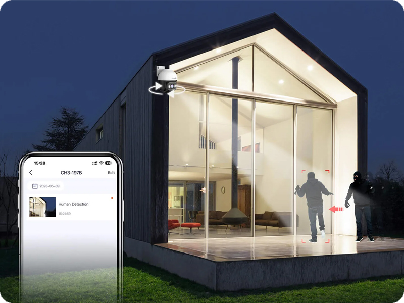 Śledzenie osób Wykrywanie pojazdów Sterowanie przez aplikację mobilną Sterowanie głosowe (Amazon Alexa) Wykrywanie ludzi Alarm świetlny i dźwiękowy |