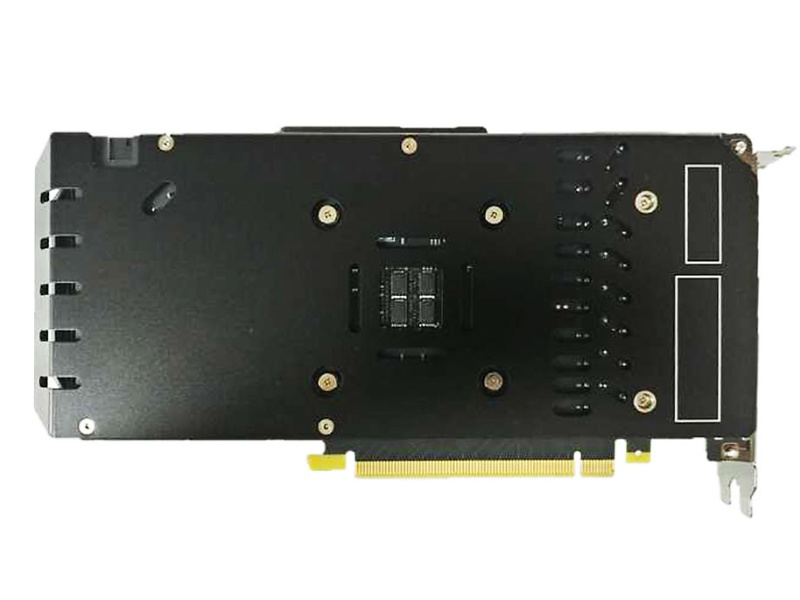 Tył karty graficznej OCPC został zabudowany płytą nośną. Ta chroni płytkę drukowaną przed czynnikami zewnętrznymi oraz usztywnia konstrukcję. Wycięte na brzegu otwory ułatwiają naturalny przepływ powietrza przez radiator, usprawniając chłodzenie.