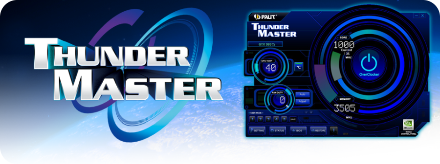 Aby zoptymalizować rewolucyjne właściwości kart z serii GeForce, Palit przedstawił nową wersję “ThunderMaster” – narzędzia do overclockingu, które w pełni wspiera technologię NVIDIA-GPU Boost. Oprogramowanie to pozwala na inteligentne monitorowanie prędkości taktowania w celu zapewnienia, że GPU pracuje bezpiecznie podczas osiągania wysokiej wydajności. Dodatkowo umożliwia ustawienie wartości, takich jak kontrola temperatury GPU czy kontrola ilości klatek na sekundę.Palit ThunderMaster pozwala na podniesienie wydajności do granic możliwości!